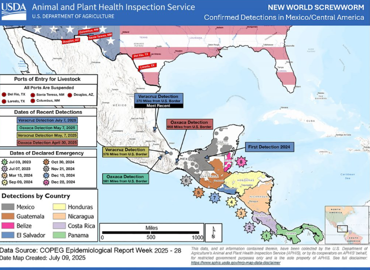 While USDA announced a risk-based phased port re-opening strategy for cattle, bison, and equine from Mexico beginning as early as July 7, 2025, this newly reported NWS case raises significant concern about the previously reported information shared by Mexican officials and severely compromises the outlined port reopening schedule of five ports from July 7-September 15. Therefore, in order to protect American livestock and our nation’s food supply, Secretary Rollins has ordered the closure of livestock trade through southern ports of entry effective immediately.