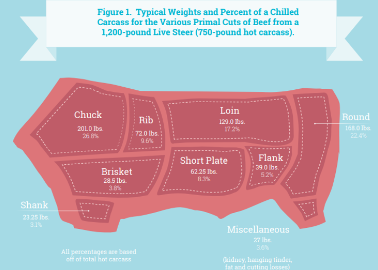 If basing the prediction off of the HCW, expect to take home roughly two-thirds. For example, if we had a butcher calf with a 1,500 pound live finished weight, a dressing percentage of 63% would result in a 945 pound hot carcass weight. After breaking down the carcass and packaging the cuts, we should expect about 630 pounds of beef. The actual amount of product taken home for consumption will vary based on degree of fatness and muscularity, cutting specs and carcass aging.