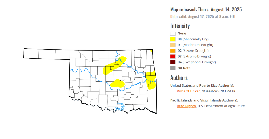 Dr. Hall adds the location in Mexico that had the closest confirmed NWS- about 370 miles south of the southern tip of Texas- has not seen any new cases of NWS since the initial positive test. Dr. Hall told Ron Hays ” there have been no new cases of New World Screwworm in that area 370 miles south of Texas for several weeks” and that USDA officials believe that they may have stopped any advance from that location- and in fact are reporting the new cases in Mexico are occurring about 700 miles south of Texas. He adds he understands that some sterile flies continue to be released in the area of the case in Veracruz (370 miles south of Texas) but that most of the flies are being used in that hot zone 700 miles south of Texas. |  |    |   | Abnormally Dry Conditions Spread In This Weeks Drought Monitor |  |    |   | According to the latest Oklahoma drought monitor report, exceptional drought remains at zero percent, unchanged from the start of the calendar year. Extreme drought or worse conditions remain at zero percent, unchanged since the week of October 29, 2024. Severe drought or worse conditions remain at zero percent, unchanged since the week of May 29, 2025. Moderate drought or worse conditions remain at zero percent, unchanged since last week. Abnormally dry or worse conditions have spread into the central and eastern parts of Oklahoma this week.