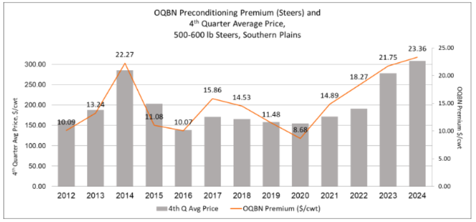 The graph shown overlays the average preconditioning premiums ($/cwt) for steers received by Oklahoma Quality Beef Network (OQBN) cattle from 2012 through 2024 with the average 4th Quarter price (Oct-Dec) for 500-600 pounds steers in those same years. Average price is represented by the bars with the price scale on the left. The corresponding premiums are represented by the orange line and the price scale on the right. The pattern is clear – premium levels tend to move with price levels.