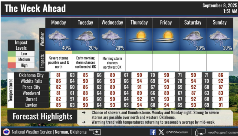 After two weeks of “lovely fall’ish weather,” Oklahomans are in for a change as temperatures are expected to return to more normal, and even above-normal, levels for the next couple of weeks. The recent cool front, which brought a respite from the summer heat, is fading away, but residents won’t have to worry about a return to triple-digit temperatures. Instead, the forecast calls for temperatures to threaten the 90-degree mark more often than not.