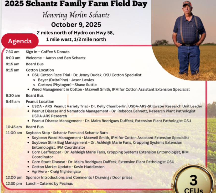 The 2025 Schantz Family Farm Field Day, honoring Merlin Schantz, is scheduled for October 9, 2025. The event, located a few miles north and west of Hydro, Oklahoma, will bring together agricultural experts and producers to discuss the latest research and management strategies for cotton, peanuts, soybeans, and corn.