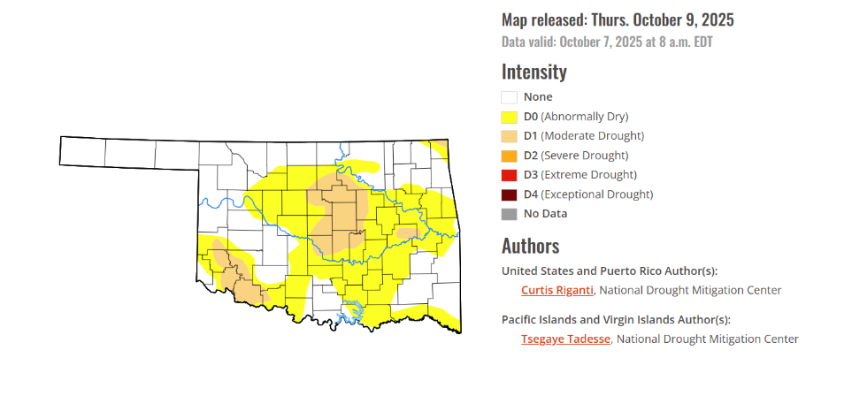 According to the latest Oklahoma Drought Monitor report, exceptional drought remains at 0 percent, unchanged from the start of the calendar year. No Severe Drought: As of October 7, 2025, no part of Oklahoma is classified in the D2 (Severe), D3 (Extreme), or D4 (Exceptional) categories. Rapid Expansion of Moderate Drought: The area under Moderate Drought (D1) has significantly expanded, covering 12.10% of the state, up from less than 5% the previous week. Widespread Dryness: Over half of the state (52.13%) is now experiencing at least Abnormally Dry (D0) conditions, which is the pre-drought phase where crops begin to show stress and winter wheat germination may be delayed.