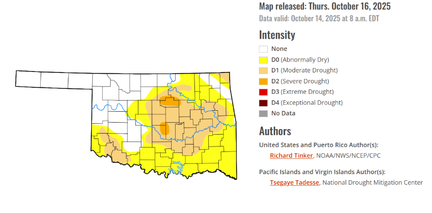 Severe Drought: As of October 16, 2025, severe drought (D2) has emerged in Payne, Noble, Pawnee, Cleveland, Oklahoma, and Pottawatomie counties, covering 1.97% of the state. Moderate Drought (D1) more than doubles- jumping from 12% a week ago to 29.1% this week. Widespread Dryness: Over 65 percent of the state is now experiencing abnormally dry to severe drought conditions ( D0-D2).