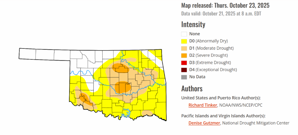 Severe Drought: Severe drought (D2) has now spread in southwestern Oklahoma, affecting Gerrer, Jackson, Tillman, and Kiowa counties, covering 5.73 percent of the state. Widespread Dryness: Over 72 percent of the state is now experiencing abnormally dry to drought conditions.