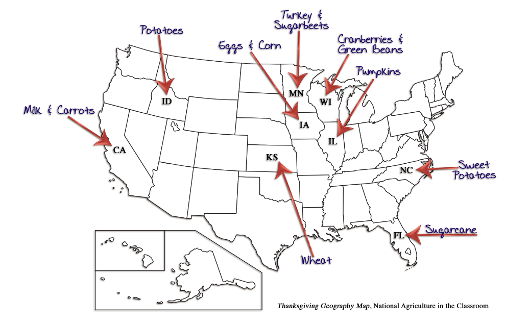 Thanksgiving is a traditional American holiday celebrated in November. The holiday has historical roots to the early pilgrims who settled America. It’s purpose is to celebrate the year’s harvest and give thanks. This lesson provides an opportunity for students to recognize the foods they will likely consume in a traditional Thanksgiving dinner and learn how and where they are likely produced.