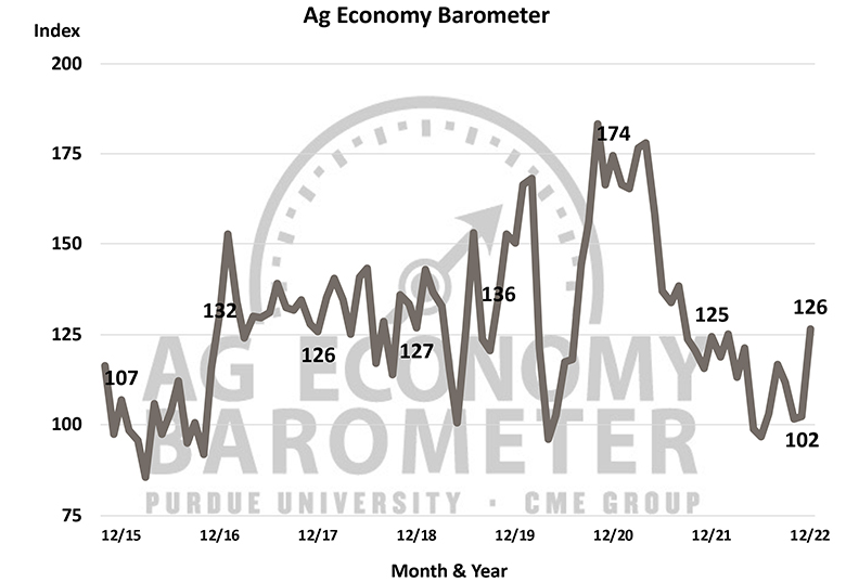 “The improvement in current sentiment was motivated by producers’ stronger perception of current financial conditions on their farms and could be attributed to producers taking time to estimate their farms’ 2022 income following the completion of the fall harvest,” said James Mintert, the barometer’s principal investigator and director of Purdue University’s Center for Commercial Agriculture.