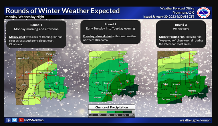 Strange weather we are having here today, even for Oklahoma! Much of the state woke up to “Thunder Sleet” With heavy showers of sleet falling, thunder, and lightning. State Climatologist Gary McManus says this is the first wave, “We start off our winter storm with waves of sleet and freezing rain today, get another dose tomorrow, then a third dose Wednesday into early Thursday.”