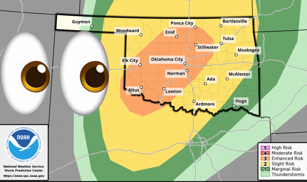 capping inversion. The cap is expected to weaken by mid evening. This, combined with a strengthening low-level jet, should allow for robust convective development. The most favorable area for organized severe storms will be from northwest Texas, extending northeastward into north-central Oklahoma. In addition to a threat for large hail,