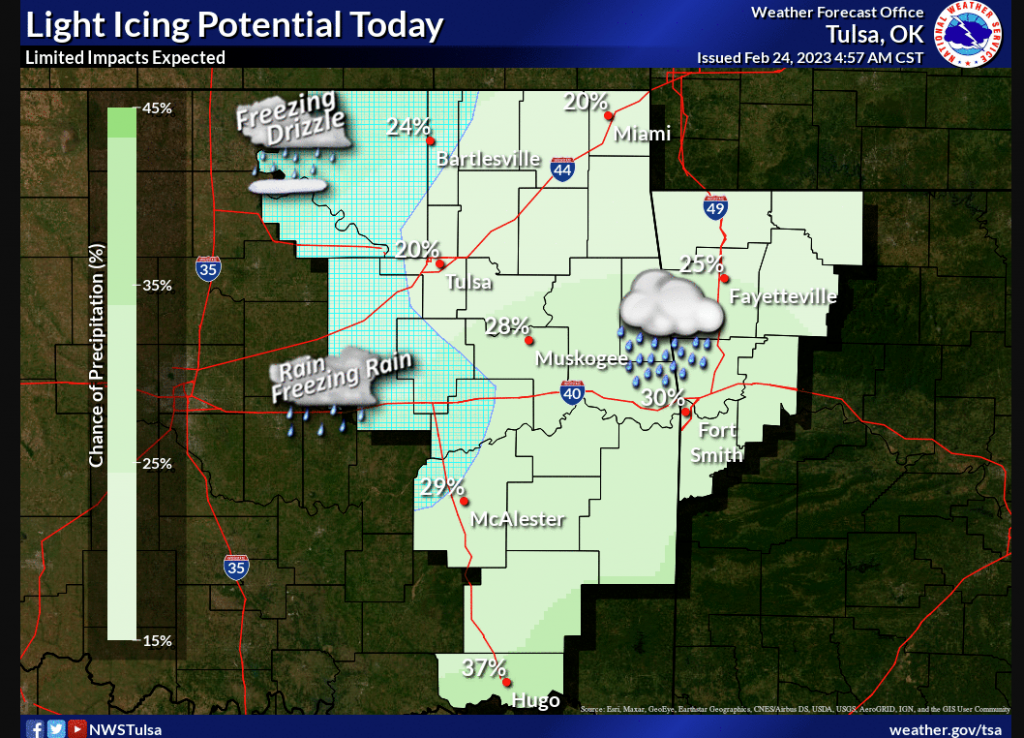 Severe Weather is forecasted for the state on Sunday. Still, State Climatologist Gary McManus says today’s weather may also present some problems: “Everybody is staring at Sunday when today might hold some unpleasant impacts as well. There is a chance for freezing mist/drizzle/rain throughout the day where the temperatures remain below freezing. It has been cold enough lately to allow some accumulation on at least bridges and overpasses.”