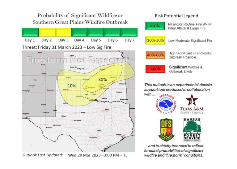 Oklahoma Forestry Services is urging Oklahomans to continue using extreme caution in the face of the strongest fire weather so far in 2023. Very high to extreme fire danger indices will develop on Friday. Wildfire concerns are expected to remain in place for the next seven days.