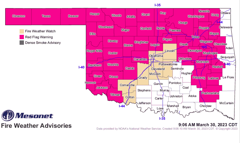 The duration of Oklahoma’s current drought has limited the amount of fuel (i.e., grass and timber litter) although when coupled with the intensity of the forecasted fire weather, sufficient fuel is in place to worsen any fires that are sparked.