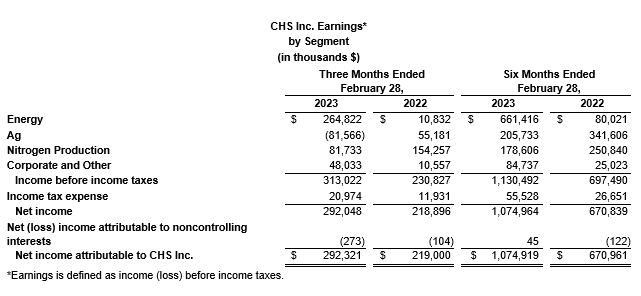 CHS Inc., (NASDAQ: CHSCP)  the nation’s leading agribusiness cooperative, today released results for its second quarter ended Feb. 28, 2023. The company reported quarterly net income of $292.3 million compared to $219.0 million in the second quarter of fiscal year 2022. For the first six months of fiscal year 2023, the company reported net income of $1.1 billion and revenues of $24.1 billion compared to net income of $671.0 million and revenues of $21.2 billion recorded in the first half of fiscal year 2022.