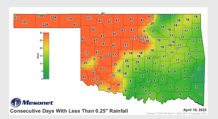 Statewide Discussion: Storms yesterday evening in parts of western and northcentral Oklahoma, bringing both rain and hail, yielded wetting isolated wetting amounts while outside of individual storm cells amounts of less than 0.10” was realized in the band of storms. Northwestern and Panhandle counties remain very dry with separation from a wetting event ranging from 43 days across most of the west to 224 days (7.5 months) in Texas County. Fire danger will remain a daily consideration until wetting moisture overspreads the area. Composite fuel dryness, with reference to Energy Release Component, has been and will remain a daunting factor evidenced in the level of fire’s resistance to control and the demand for extended resource commitment insuring thorough mop up. Less than critical fire weather is required to deliver problematic to extreme fire behavior even with below-normal herbaceous fuel loading.