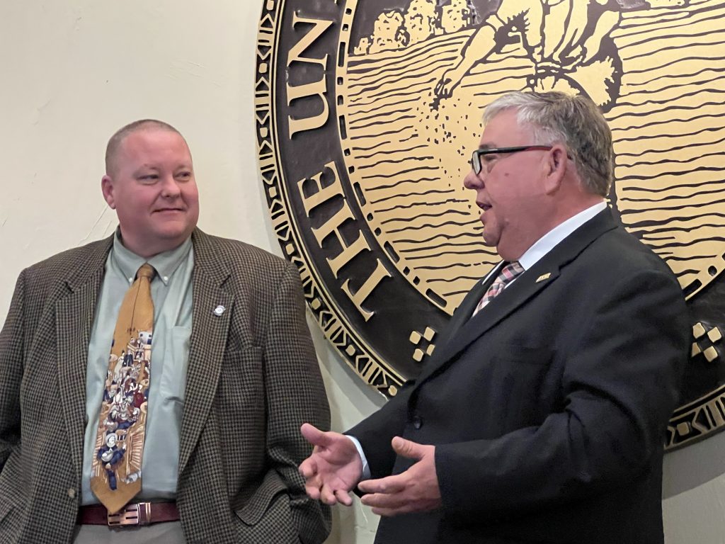 During AFR (American Farmers and Ranchers) Day at the Capitol, Farm Director KC Sheperd visited with Chairman of the House Ag Committee, Dell Kerbs about the latest legislative work for agriculture in the state.