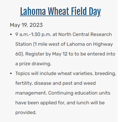 The Lahoma Wheat Field Day and Crop Tour will take place from 9am to 1:30pm on May 19th in Lahoma.