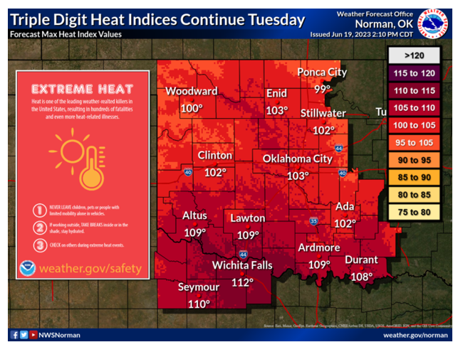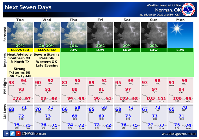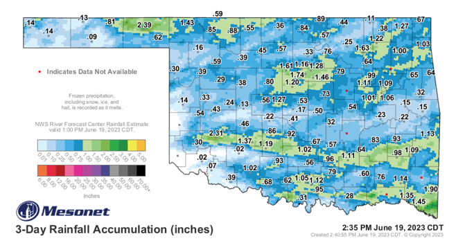 Below, see the next 7 day forecast and 3-Day Rainfall Accumulations recorded by the Oklahoma Mesonet. The next Oklahoma Harvest Report will be published on Wednesday, June 21, 2023, and a regional report will be published by Plains Grain Inc. on Friday, June 23, 2023.