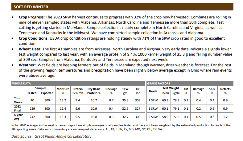 Record-breaking high temperatures were set in Texas last week, accelerating harvest and crop maturity; the first 28 HRW samples from Texas and Oklahoma have arrived at the lab for testing. The SRW harvest is 32% complete and preliminary data is included in this week’s report. Portions of the HRS region could use some precipitation, which is reflected in USDA crop condition ratings. The PNW SW crop would also benefit from rain. The northern durum crop is 98% emerged and is in good condition so far.