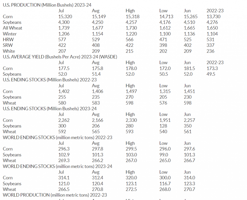 USDA estimates ending stocks for 2023-2024 wheat at mb, up from 562 mb in June. Ending stocks for old-crop wheat decreased to 580 mb from June’s estimate of 598 mb.