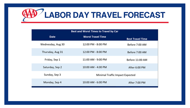INRIX, a global provider of transportation data and insights, expects Thursday, Aug. 31, between 2 and 6 p.m. to be the busiest time on the roads during the long Labor Day weekend. Friday, Sept. 1, is also expected to have higher than normal traffic volumes between 11 a.m. and 9 p.m.