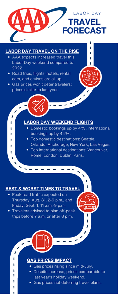 AAA expects Labor Day weekend travel to be busier this year than in 2022, on the road, in the air and for those who are cruising as well.