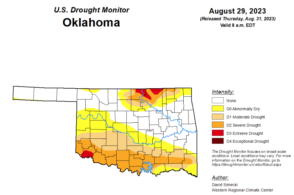 According to the latest Oklahoma Drought Monitor, exceptional drought remains at zero percent, unchanged for the past few weeks.