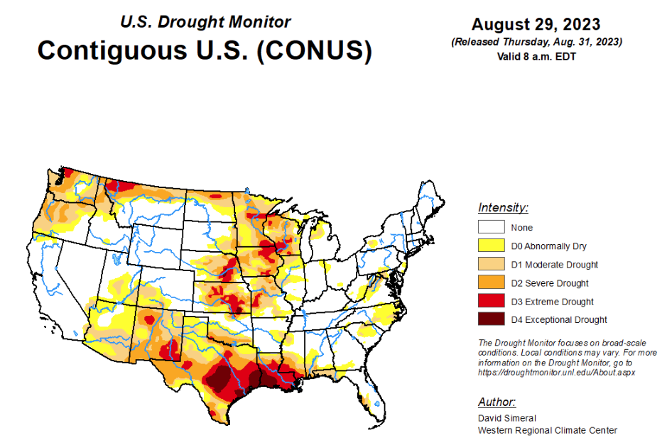 According to the latest U.S. drought monitor, this week saw continued intensification of drought across areas of the Midwest, South, Southwest, and the Pacific Northwest. In the Midwest, extreme heat impacted areas of the region including Minnesota, Iowa, Missouri, Wisconsin, and Illinois with temperatures soaring 6 to 10+ degrees F above normal. Daily high temperature records were broken across the region during the past week including in Chicago (98), Milwaukee (101), Minneapolis (101), and Des Moines (100). Similarly, areas of the South including the northern Gulf Coast of Texas, Louisiana, and southern Mississippi saw continued drought-related deterioration on this week’s map as the heatwave continued to push high temperatures over 100 degrees F with numerous records broken during the past week. Record daily highs were set or tied in various southern cities including Houston (109), San Antonio (104), Austin (107), Dallas (109), Baton Rouge (106), New Orleans (103), Jackson (106), and Mobile (101). In Louisiana and southern Mississippi, the continued hot and dry conditions have led to numerous wildfire outbreaks as well as widespread poor hydrologic conditions and severe impacts within the agricultural sector. In the Southwest, monsoon precipitation has been well below normal across much of the region with areas of southern Arizona and New Mexico reporting rainfall deficits ranging from 3 to 6 inches since the beginning of July. In the Pacific Northwest, areas of drought expanded on the map in Oregon, Washington, and Montana in response to a combination of above-normal temperatures over the past 90-day period, precipitation shortfalls, and poor surface water conditions. Conversely, some areas saw improved drought-related conditions on the map, including southern Texas where heavy rains, in association with Tropical Storm Harold last week, provided much-needed moisture to the region. Rainfall accumulations along the southern Gulf Coast and South Texas Plains regions ranged from 2 to 6 inches. In the Southeast, areas of Florida braced themselves for the impacts of Hurricane Idalia as it intensified rapidly early this week. The hurricane made landfall in the Big Bend region of Florida early Wednesday morning (8/30) as a dangerous Category3 hurricane bringing a life-threatening storm surge, catastrophic winds, and severe flooding.