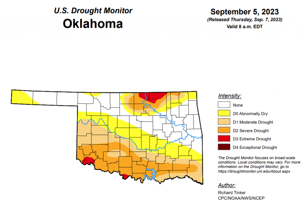 According to the latest Oklahoma Drought Monitor, exceptional drought remains at zero percent, unchanged for the past few weeks.