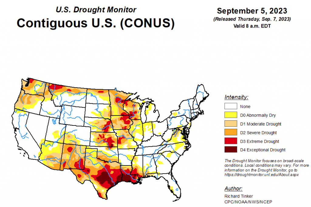 Most of the Nation, however, endured a hot and drier-than-normal week, including most areas of drought. Temperatures averaged 5 to 10 deg. F accompanied deficient precipitation over a large area from the Rockies to the Appalachians and central Gulf Coast Region, prompting drought intensification over large parts of the Upper Mississippi Valley, the Central States, and the southern tier of the country west of the Florida Panhandle. Improvement was limited to the band of heavy precipitation from Hurricane Idalia, and in scattered locales affected by the tropical moisture surge in the Desert Southwest, from southeastern Utah to central Arizona westward toward central California. According to the U.S. Department of Agriculture (USDA), the coverage of topsoils short or very short of moisture increased by 6 percent this past week, now covering 58 percent of the contiguous 48 states. This is the greatest coverage at this time of year in more than 9 years, the prior record in that short interim being just over 50 percent in 2020.