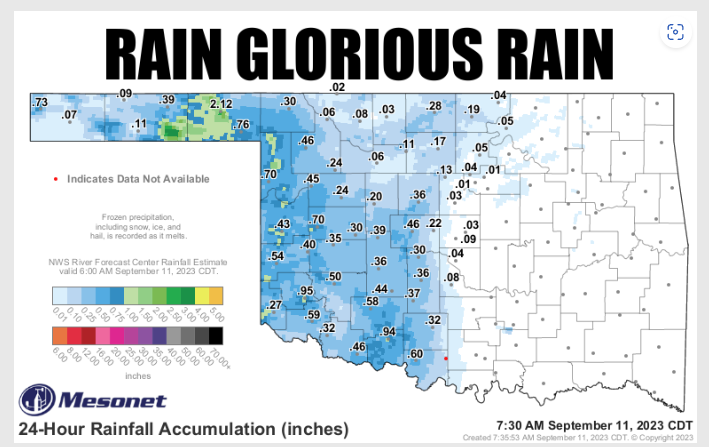While not everyone will see the rain totals add up across the state, McManus says this is the first good sign of fall we have seen in a while, “In other words…the summer as we knew it is over.” In Fact this week NW Oklahoma could see highs in the 60s for the rest of this week.