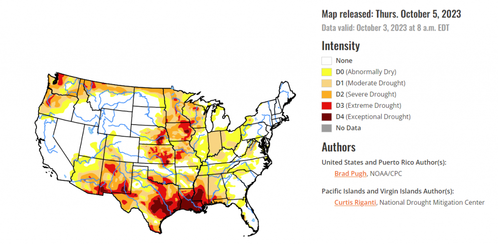 According to the latest US Drought Monitor Map, The rapid onset and intensification of drought continued across the South with drought expanding northeast from the Lower Mississippi Valley to the Tennessee Valley and Southern Appalachians. A drier-than-normal September expanded abnormal dryness (D0) and moderate short-term drought (D1) across the Upper Ohio Valley, Eastern Corn Belt, and western parts of Pennsylvania, New York, and West Virginia. Drought of varying intensity persists across the Middle to Upper Mississippi Valley and parts of the Great Plains. However, heavy rainfall at the beginning of October improved the Southern High Plains. A suppressed 2023 Monsoon intensified drought across Arizona and western New Mexico. Early fall precipitation began to ease drought along the coastal Pacific Northwest. Drought continues to worsen along the leeward side of Maui.