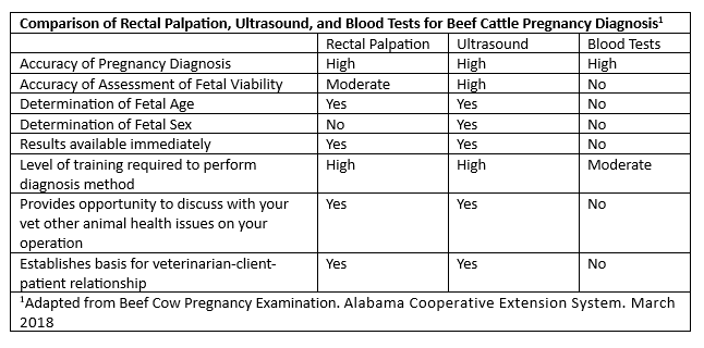 Reproductive efficiency of a beef cow herd starts with the yearly diagnosis of pregnancy. Defining the breeding season and then removing females who did not conceive or do not fit the desired calving window, allows producers several advantages. Producers who utilize pregnancy detection options typically reduce expenses, decrease labor inputs, and sell a more uniform calf crop.