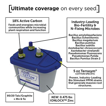 REVLINE HOPPER THROTTLE COTTON contains a full collection of microbes and micronutrients safely packaged for convenient deployment at planting. REVLINE HOPPER THROTTLE COTTON’s BIO-CAPSULEs are charged with newly added, crop-specific strain of Terrasym® for cotton in conjunction with a powerful consortium of 10 bio-fertility and N-fixing microbes that focuses on the nutritional needs and stresses facing cotton. In addition, Meristem’s new Active Carbon Technology™ feeds these aggressive microbes and helps protect the cotton crop during events that bring plant stress. All of these unique offerings are released at planting in conjunction with a micronutrient blend featuring manganese and IONLOCK™ zinc. It’s carried to the seed in an 80/20 talc/graphite seed fluency agent and each pail is treats 20 units of cotton at planting.