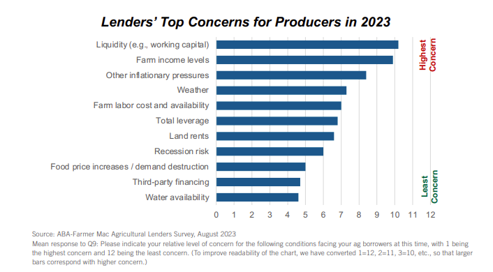 Liquidity and farm income returned to the top of the list of lender concerns for producers. Concerns about other inflationary pressures (rising interest costs), the No. 1 concern in 2022, fell to the third greatest overall concern for producers in 2023. Recession risk remained a middling concern for lenders despite worries about an economic slowdown over the coming year.