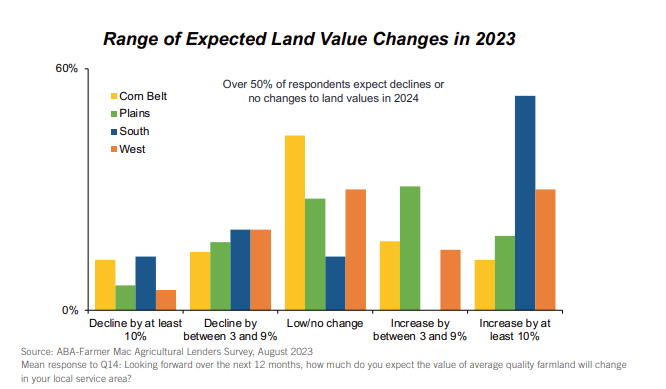 Survey respondents across all regions reported lower ag loan delinquencies and charge-off rates in 2023. However, lenders expect credit quality to deteriorate in the coming 12 months, reverting to historic levels. Consistent with this expectation, more than two-fifths of respondents reported tightening underwriting standards and loan terms in 2023 (up from 30% and 22%, respectively, in 2022).