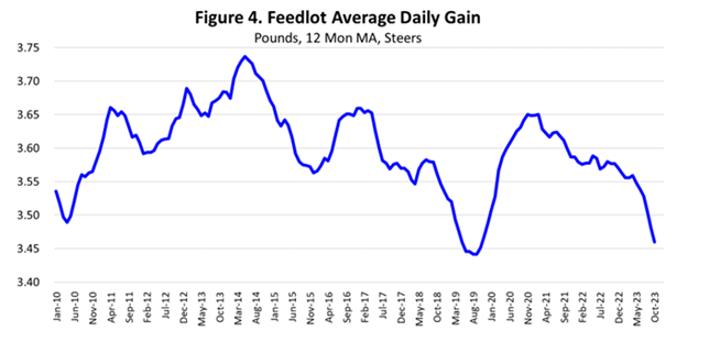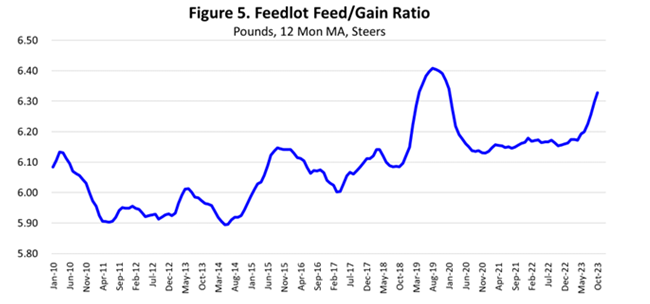 Figure 4 shows that average animal performance is quite variable over time. Average daily gain (ADG) is very seasonal and is impacted by weather, placement weight, feed markets, and cattle cycles, in addition to long-term trends. Feedlot ADG appears to have generally decreased since the peak in 2014. Most relevant to the current situation is the sharp drop in average daily gain in the past twelve months. Since late 2022, the twelve-month moving average of ADG has decreased by 3.4 percent to a current level of 3.46 pounds per day.