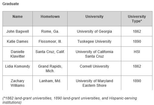 Now in its 17th year, the USDA Future Leaders in Agriculture program is aimed at undergraduates and graduate students majoring in agriculture-related subjects, including business, economics, communications, nutrition, food science, and pre-veterinary studies. The program seeks students who exhibit leadership at their university or in their community. For their applications, undergraduate students wrote essays on “Agriculture as a Career,” while graduate students explored “The Greatest Challenge Facing Agriculture over the Next Five Years.”