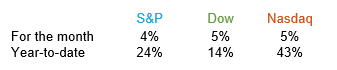 The treasury market fluctuated with the 10-year treasury ending 2023 at 3.88% which was very close to where it began the year. The 10-year rate reached a 16-year high above 5% but retreated by year-end. Meanwhile, the 2-year treasury closed at 4.25% in comparison to 4.43% on January 1. The 30-year came in at 4.03% which was only 0.06% higher than at the beginning of the year. The 2023 equity market reflected a bull environment beating expectations for the year. The S&P 500, Dow Jones Industrial Average and Nasdaq had rates of return for the year of 24%, 14% and 43%, respectively. The S&P earned 4%, the Dow was at 5% and the Nasdaq at 5% for the month of December. According to Barron’s the Dow topped 37000 for the first time and set seven record closes in the final days of 2023. A mania surrounding artificial intelligence and big technology stocks sent the Nasdaq soaring.