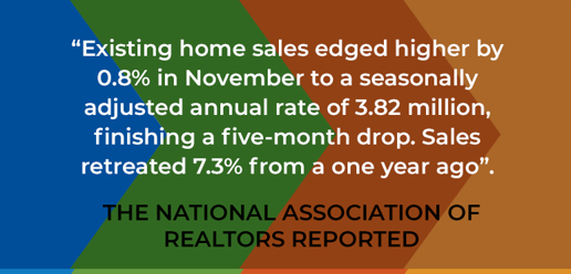 Home sales continue to be affected by low supply with the median price in November rising by 4% on an annualized basis to $387,600. The inventory of unsold existing homes dropped by 1.7% to 1.13 million which represented a 3.5 months’ supply.