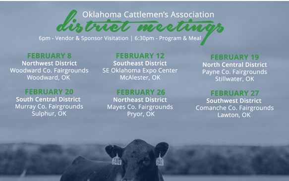 | Join Us – OCA Spring District Meetings February 2024 Spring District Meetings Are Around the Corner! Mark your calendars for the upcoming Spring District Meetings—a time of community, insights and shared passion for the beef industry. From informative discussions to networking opportunities, these meetings are your chance to connect with fellow enthusiasts and contribute to the thriving cattle community. 6:30 pmSupper will be served Legislative Issues Discussed | Sponsor Presentations | Oklahoma Beef Council Update | Update District Election for OCA Nomination Committee Thanks to our title sponsor ADM Cattle Nutrition for making these possible! |