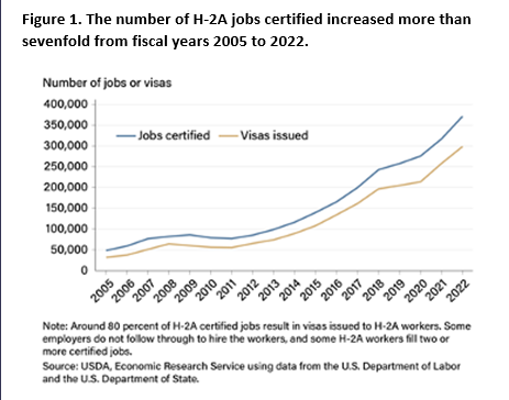 A significant demand for farm workers in the production, harvesting, and packing of fresh, higher-valued crops is evidenced by the increase in H2A certifications from approximately 48,000 in FY 2005 to 370,000 in FY 2022 (Figure 1). Despite this shift, total employment across produce operations has seen minimal growth in recent years. The surge in H2A certifications, particularly in southern states, highlights the industry’s dependence on seasonal labor. Addressing labor challenges continues to be a critical factor for maintaining economic viability.