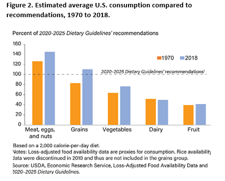 US consumers’ declining consumption of fruits and vegetables over the past two decades, coupled with a shortfall in meeting recommended dietary guidelines, raises concerns for public health (Figure 2). Strategies to bridge this gap involve not only production considerations but also consumer education to expand palates and encouragement to add produce to their diets to support health and wellness.