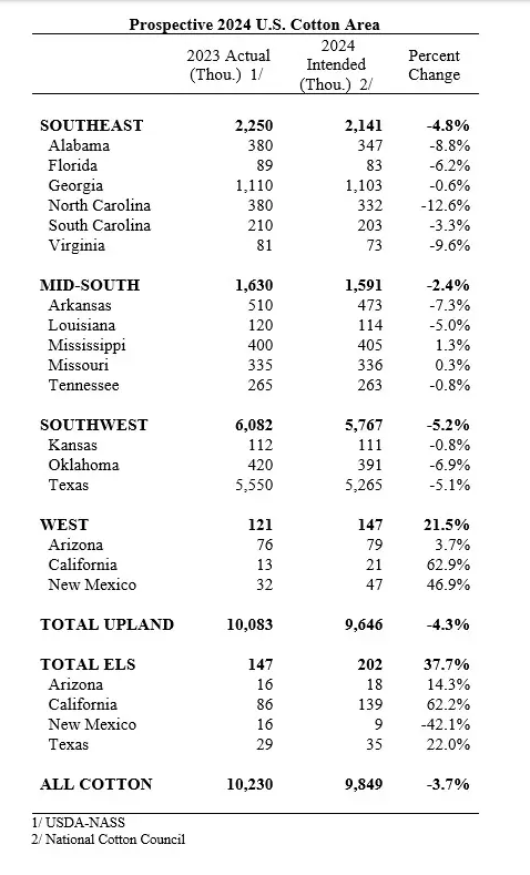 U.S. cotton producers intend to plant 9.8 million cotton acres this spring, down 3.7 percent from 2023, according to the National Cotton Council’s 43rd Annual Early Season Planting Intentions Survey. (see table attached)