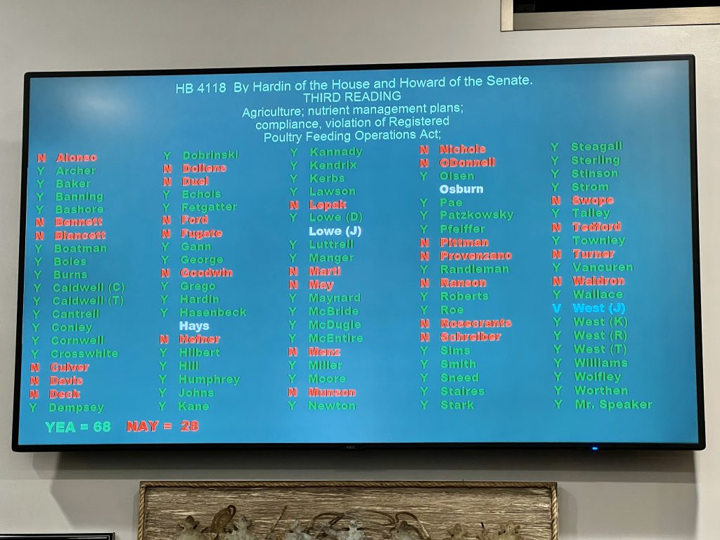 The Oklahoma House of Representatives passed HB 4118 on Monday- a measure that offers protection to poultry growers from litigation as the result of application of poultry litter that is handled under a nutrient management plan approved by the Oklahoma Department of Agriculture.