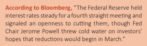 The Federal Reserve left interest rates unchanged while the federal funds rate sits at a 22-year high of 5.25%- 5.5%. Federal Reserve Chair Jerome Powell noted that it is not appropriate to reduce the target range until more data confirms a downward trend in the rate of inflation towards the target of 2%. Powell acknowledged positive inflation progress but warned that cutting rates too soon could be highly consequential.