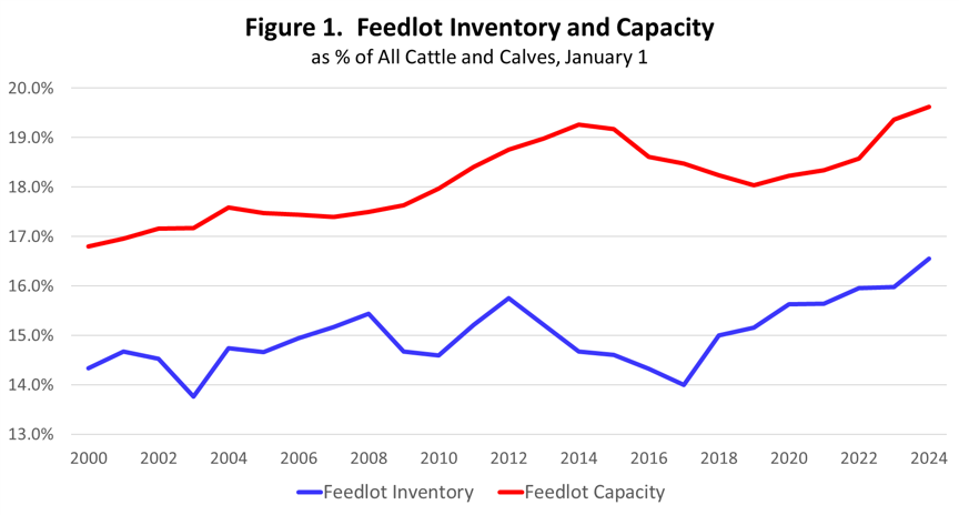The total U.S. feedlot inventory on January 1, 2024 was 14.42 million head. The feedlot inventory as a percent of the total inventory of cattle in the country has continued to increase over time. The total feedlot inventory was a record level of 16.5 percent of the inventory of all cattle and calves on January 1, 2024. This level compares to 14.3 percent 25 years ago.