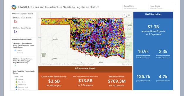 The OWRB Activities and Infrastructure Needs by Legislative District dashboard is now available to assist with identifying the water-related needs of Oklahoma communities! The statistics and interactive map utilize data from the Oklahoma State Flood Plan, Oklahoma Comprehensive Water Plan (OCWP) Clean Water Needs Survey, and OCWP Water Supply Infrastructure Needs Survey.