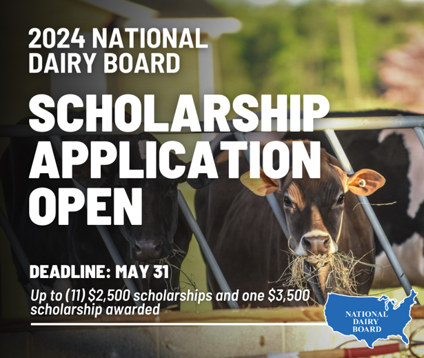 Applications can be found at usdairy.com/about-us/dmi/scholarship Completed applications must be received no later than May 31,2024, at 11:59 p.m. CST. Questions about the program can be submitted to ndbscholarships@dairy.org