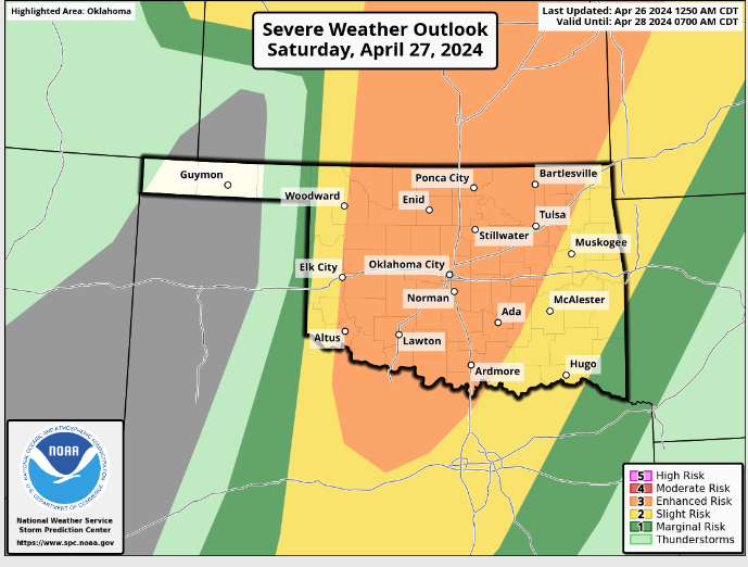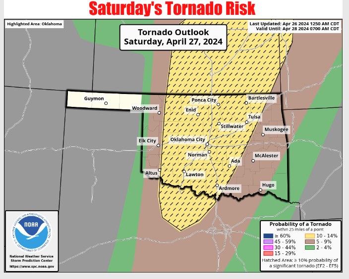 It looks like Oklahomans will have to be weather-aware this weekend as storms can possibly enter the state. State Climatologist Gary McManus says Saturday will be one of ‘those’ days in Oklahoma, “We have several ways to get severe weather tomorrow…along the dryline from Kansas down through western OK into Texas, along the warm front up north, and in the warm sector everywhere in between. Oh yeah, along an advancing cold front, too. Like the graphic says…it’s complicated but also pretty simple. Just get and remain prepared throughout the day tomorrow.”