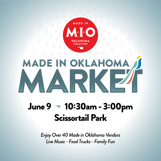 The Made in Oklahoma Coalition (MIO) invites Oklahomans to join us in supporting and celebrating all things local by attending the inaugural MIO Market at Scissortail Park on Sunday, June 9th from 10:00am – 3:00pm. This free festival will highlight over 40 Oklahoma-made vendors who will be sampling and selling their products all-day long.